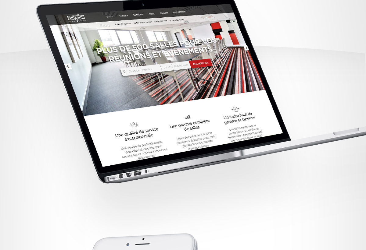 Remaniement de l’identité visuelle et du site internet d’Eurosites, un des leader de la location de salles en france.
